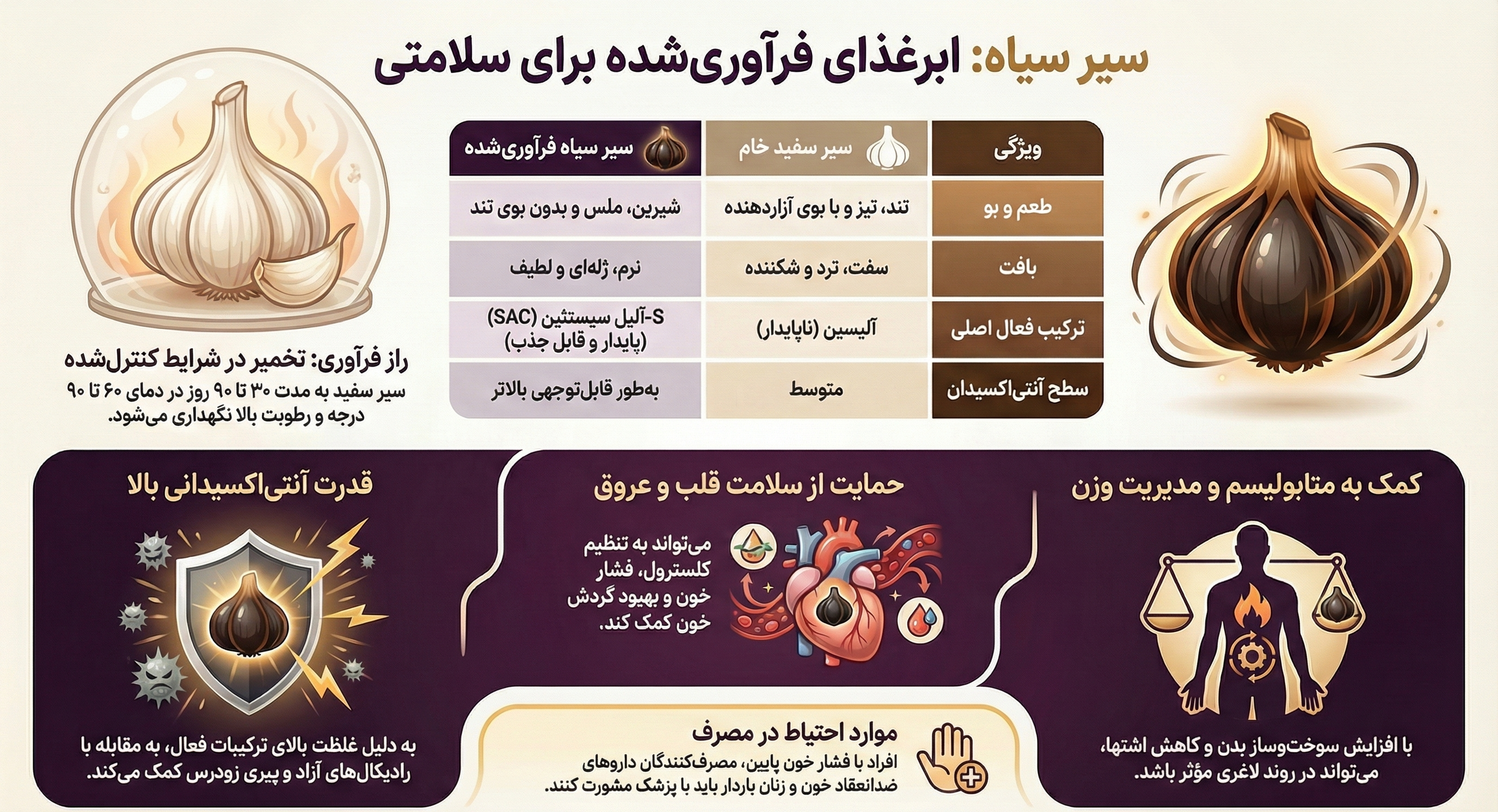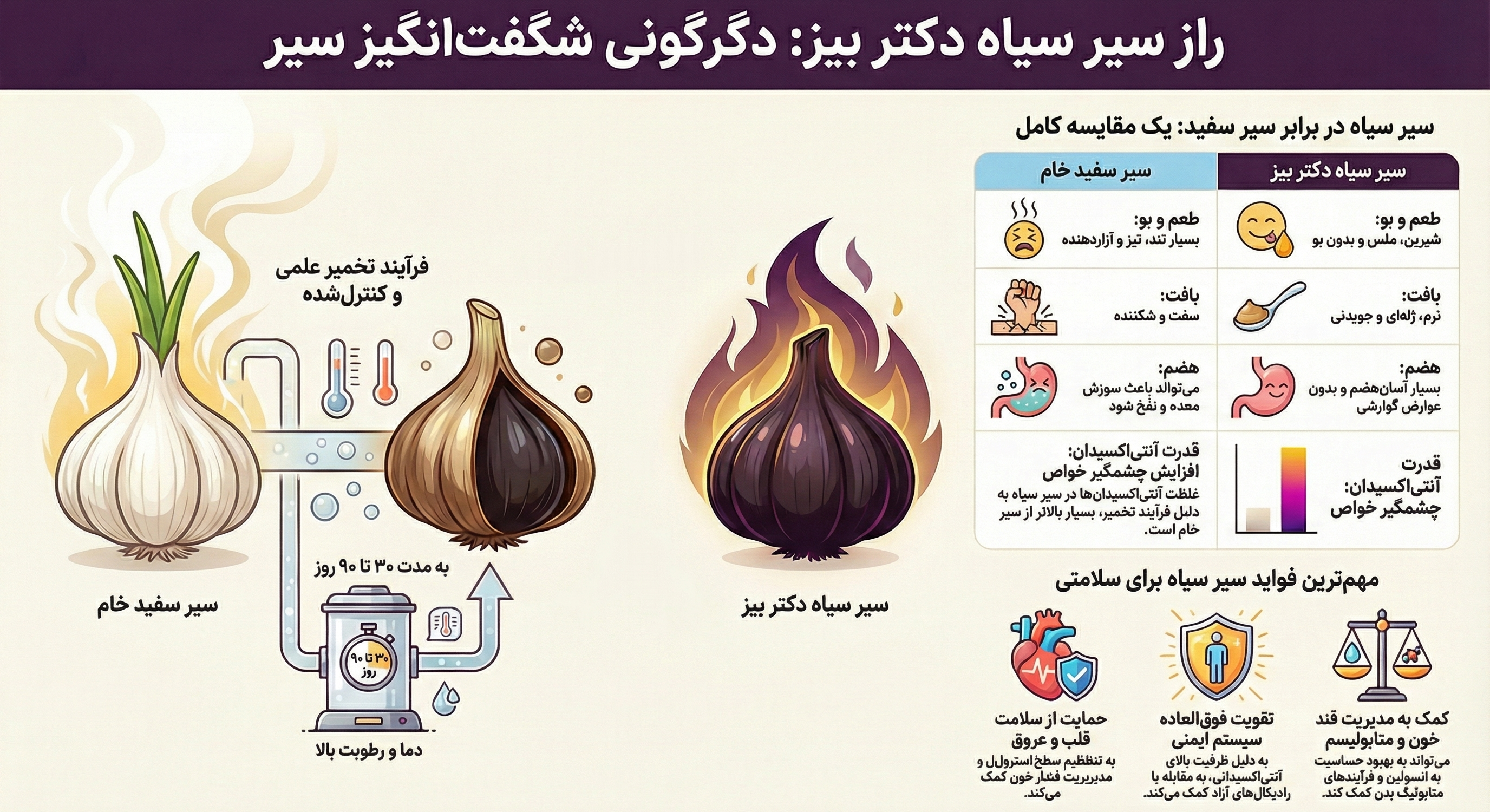 جناب مهدوی عزیز، تحقیقات نشون داده که سیر سیاه تا ۴ الی ۵ برابر آنتیاکسیدان بیشتری نسبت به سیر سفید داره. همچنین هضمش برای معده خیلی راحتتره و خواص ضدسرطانیاش به مراتب بالاتره.