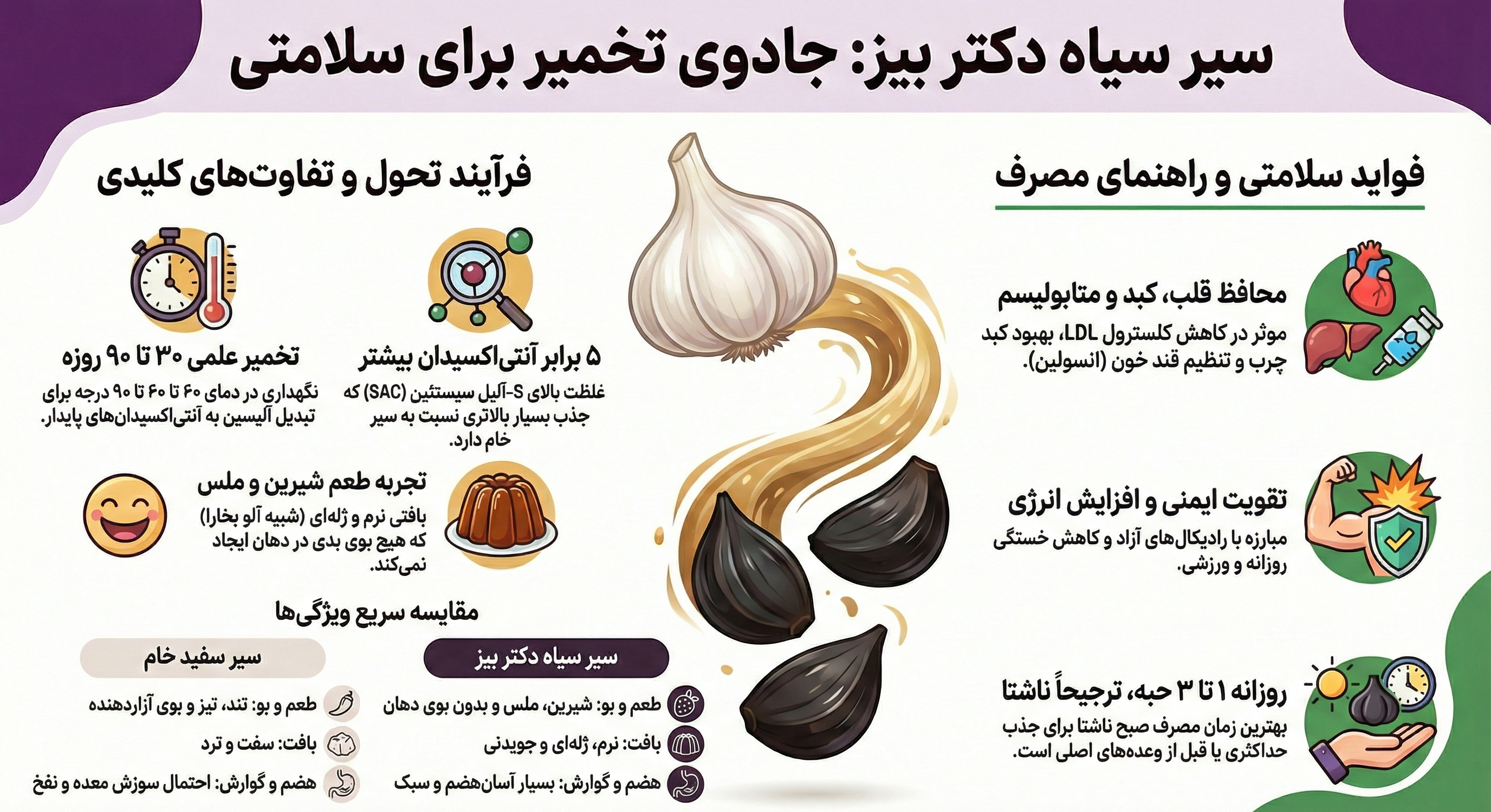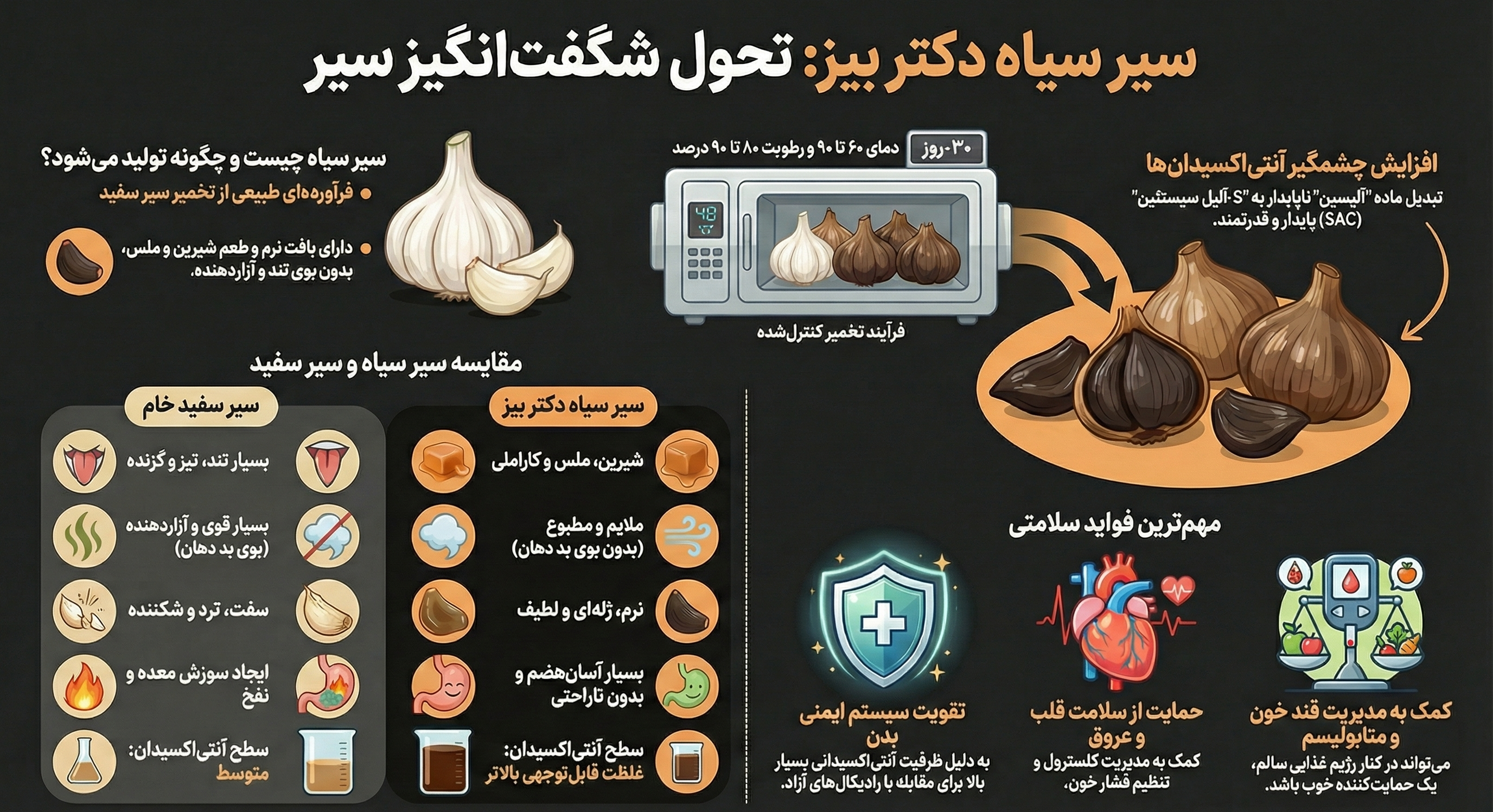 سیر سیاه (Black Garlic) یک گونه گیاهی جدید نیست، بلکه همان سیر سفید معمولی (Allium sativum) است که طی یک فرآیند علمی و کنترلشده، دستخوش دگرگونی عمیق بیوشیمیایی میشود. این فرآیند، نه تنها طعم تند و بوی آزاردهنده سیر خام را از بین میبرد، بلکه خواص آنتیاکسیدانی آن را به طور قابل توجهی افزایش داده و ترکیبات فعال جدیدی را در آن به وجود میآورد. سیر سیاه دکتر بیز با بهرهگیری از فناوری دقیق، محصولی با بافت نرم، طعمی شیرین و ملس (شبیه به آلو بخارا یا تمرهندی) و خواص تغذیهای منحصربهفرد ارائه میدهد.