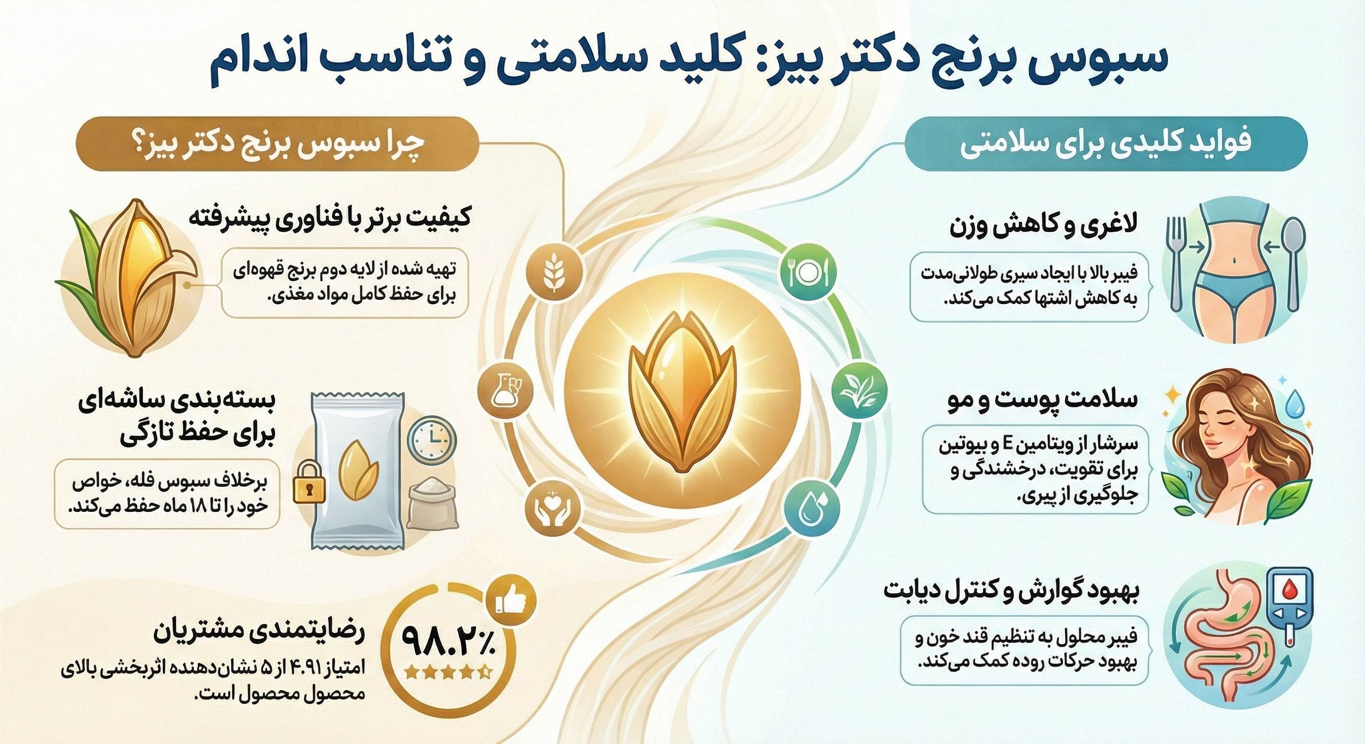 سبوس برنج دکتر بیز (بین استار)، با توجه به منبع غنی از لایه دوم برنج قهوهای و فرآوری هوشمندانه در بستهبندی ساشهای، یک مکمل غذایی بینظیر برای ارتقای سلامت عمومی بدن است. این محصول با ارائه ترکیبی بینظیر از فیبر، ویتامینهای گروه B و آنتیاکسیدانها، نه تنها به بهبود عملکرد دستگاه گوارش و کنترل وزن کمک میکند، بلکه نقش مؤثری در تقویت پوست و مو، تنظیم قند و کلسترول خون، و افزایش سطح انرژی ایفا مینماید. با خرید سبوس برنج دکتر بیز از فروشگاه معتبر گانودرما بیز، شما اطمینان خاطر از دریافت محصولی اصیل و با کیفیت را خواهید داشت که با بهترین قیمت سبوس برنج دکتر بیز به دست شما میرسد و میتواند گامی مهم در مسیر سلامتی و شادابی شما باشد.