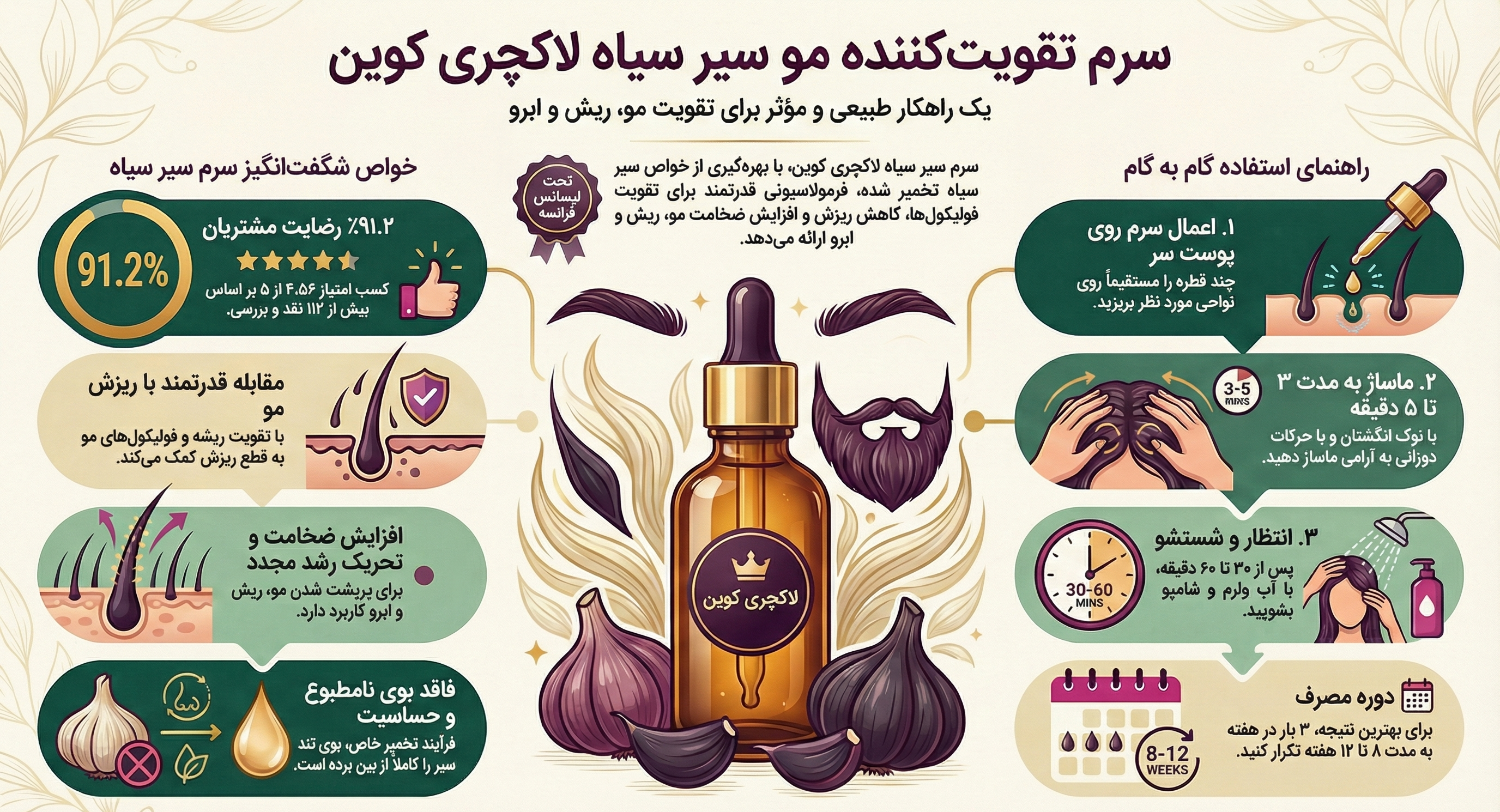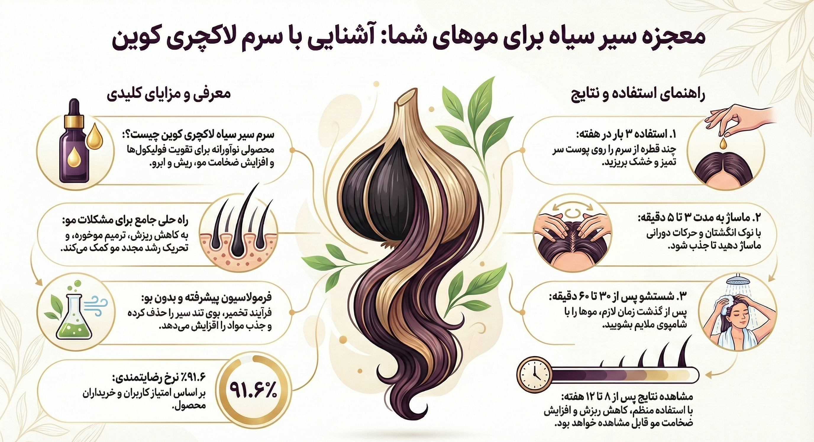 یکی از مهمترین ویژگیهای سرم سیر سیاه لاکچری کوین، ساختار ریزمولکولی آن است که امکان جذب عمیق و سریع توسط پوست و فولیکولهای مو را فراهم میآورد. این جذب سریع، باعث میشود تا مواد مغذی به طور مستقیم به لایههای زیرین پوست و ریشه موها برسند و اثربخشی محصول را به حداکثر برسانند. در نتیجه، این سرم نه تنها به تقویت و ضخیم شدن تارهای مو کمک میکند، بلکه با تحریک فولیکولهای خفته، رویش مجدد موها را نیز تسهیل میبخشد. علاوه بر این، خواص ضدباکتریایی و ضدقارچی قوی سیر سیاه، به حفظ سلامت پوست سر و جلوگیری از بروز مشکلاتی نظیر شوره و خارش کمک میکند.