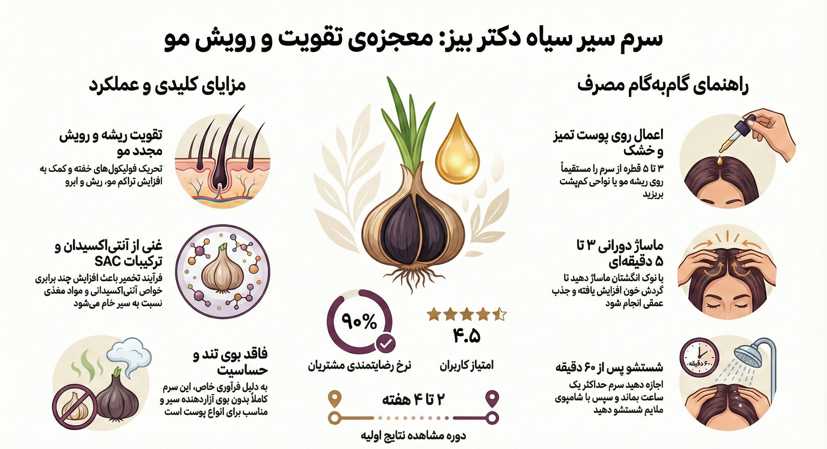 ابتدا فکر میکردم سیر سیاه ممکنه بوی تندی داشته باشه، اما این سرم بوی خیلی ملایم و خوبی داره. قدرت جذبش روی پوست سر عالیه و اصلاً باعث چرب شدن بیش از حد مو نمیشه.