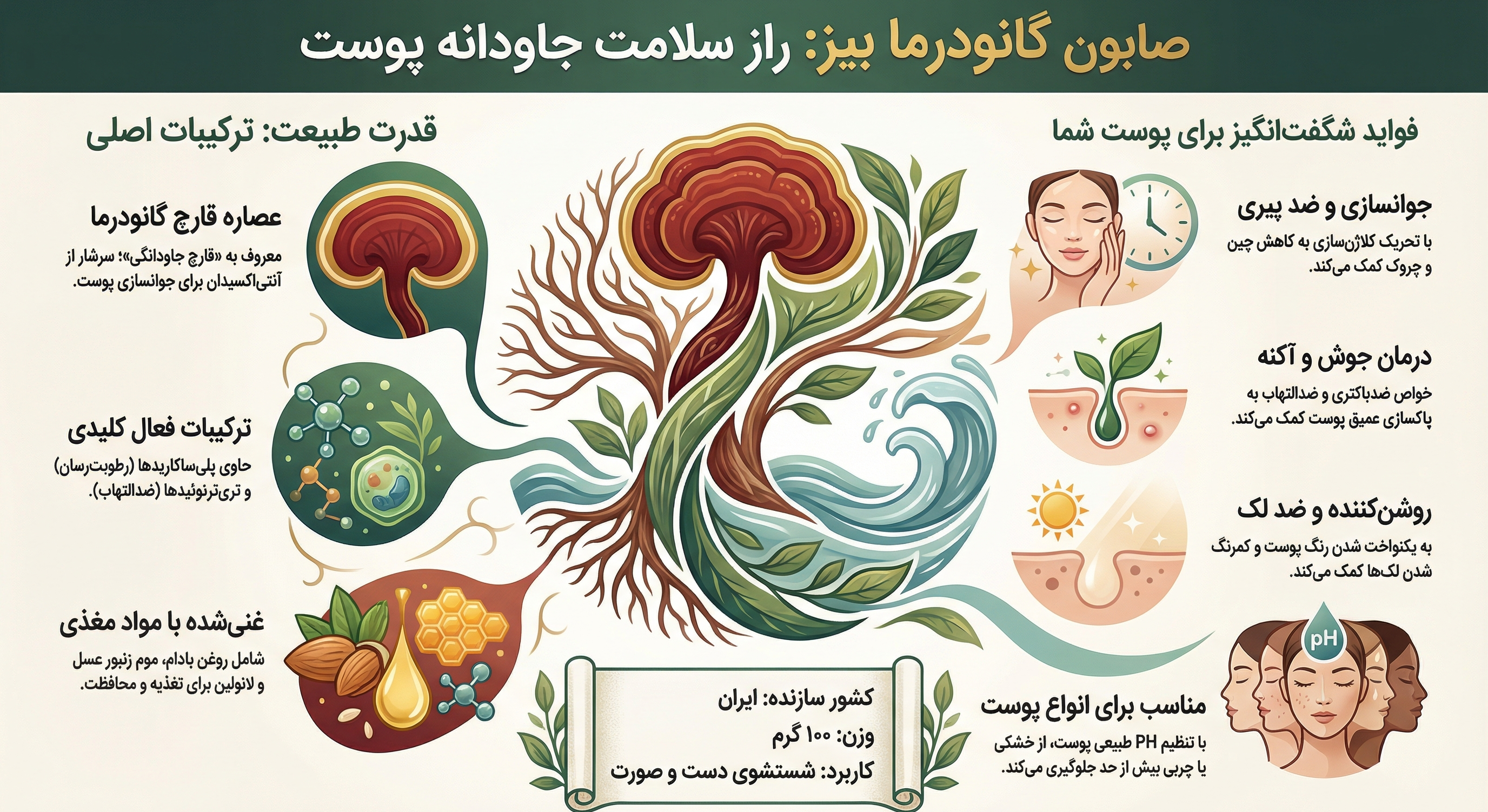| نام کامل محصول | صابون دست و صورت حاوی عصاره قارچ گانودرما بیز |