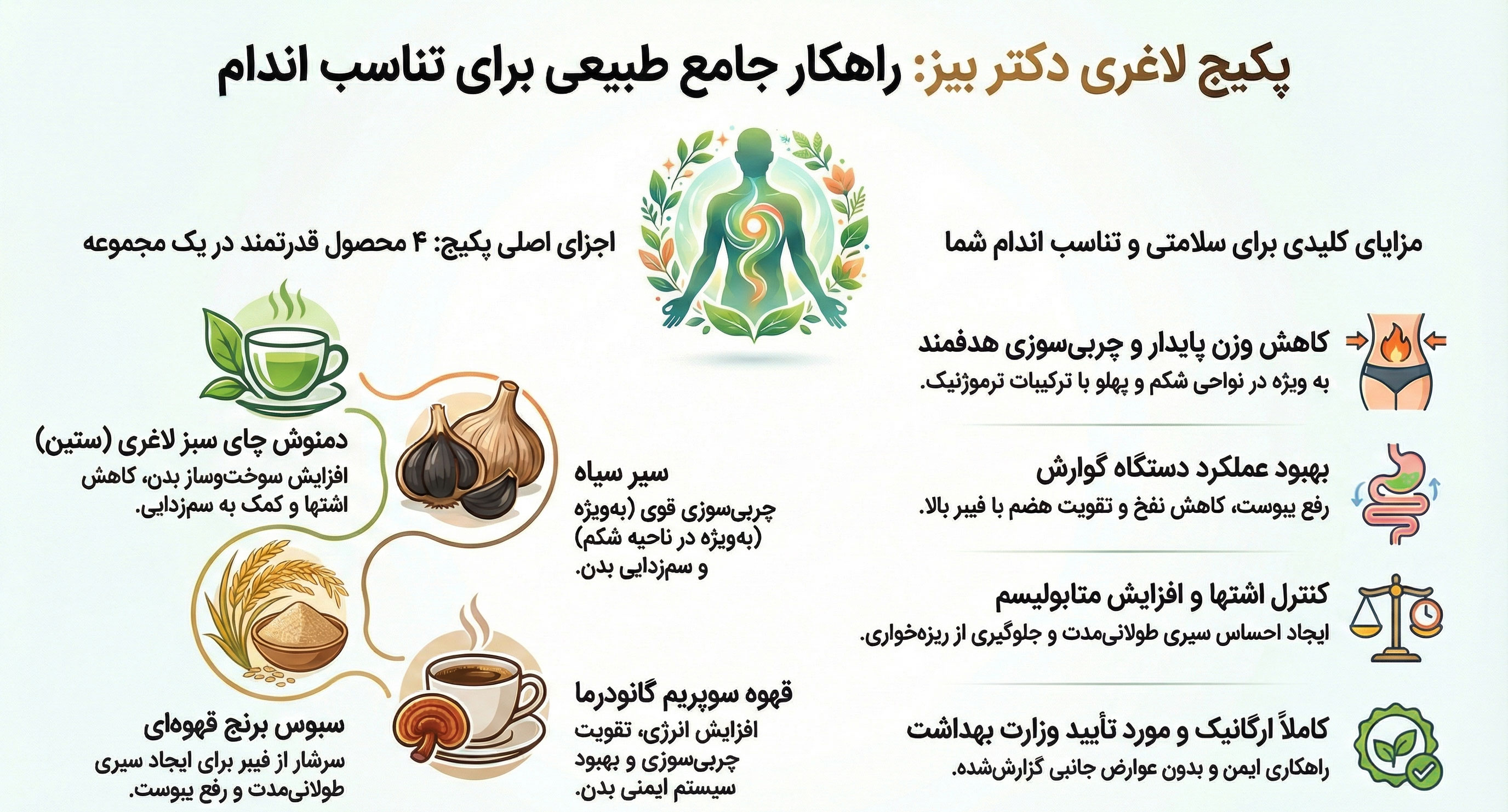 | نام کامل محصول | پکیج لاغری دکتر بیز (شامل دمنوش چای سبز لاغری، سیر سیاه، سبوس برنج قهوهای، قهوه سوپریم گانودرما) |